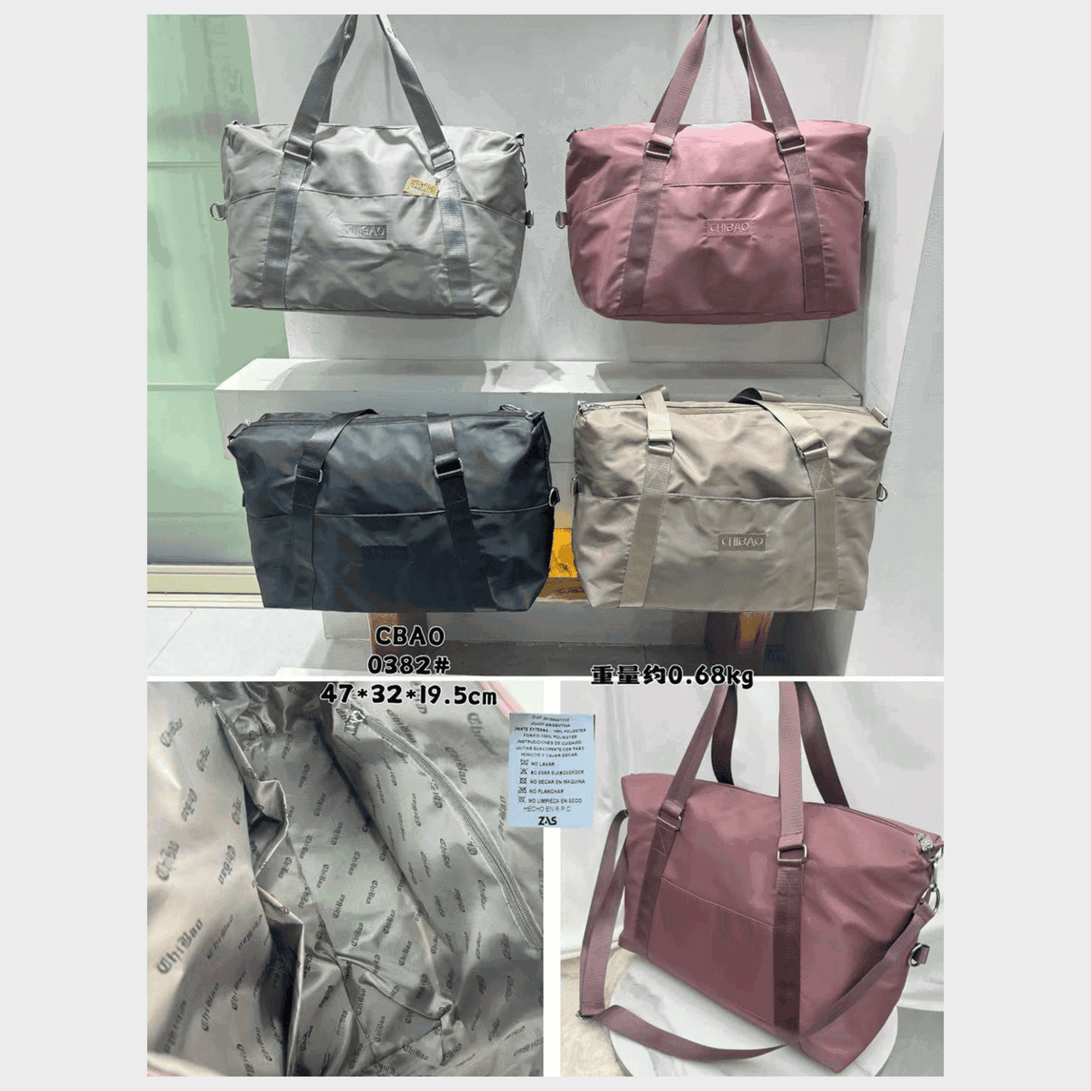 Material: Tela impermeable de alta resistencia, costuras y cierres reforzados.
