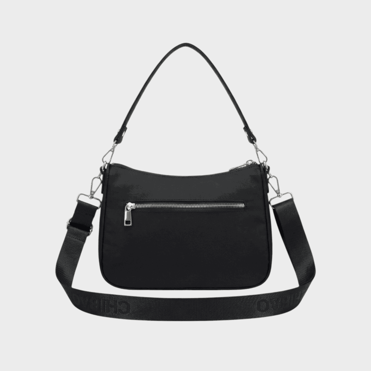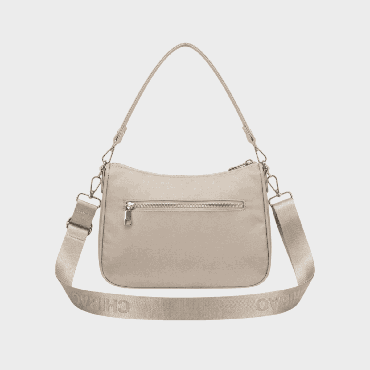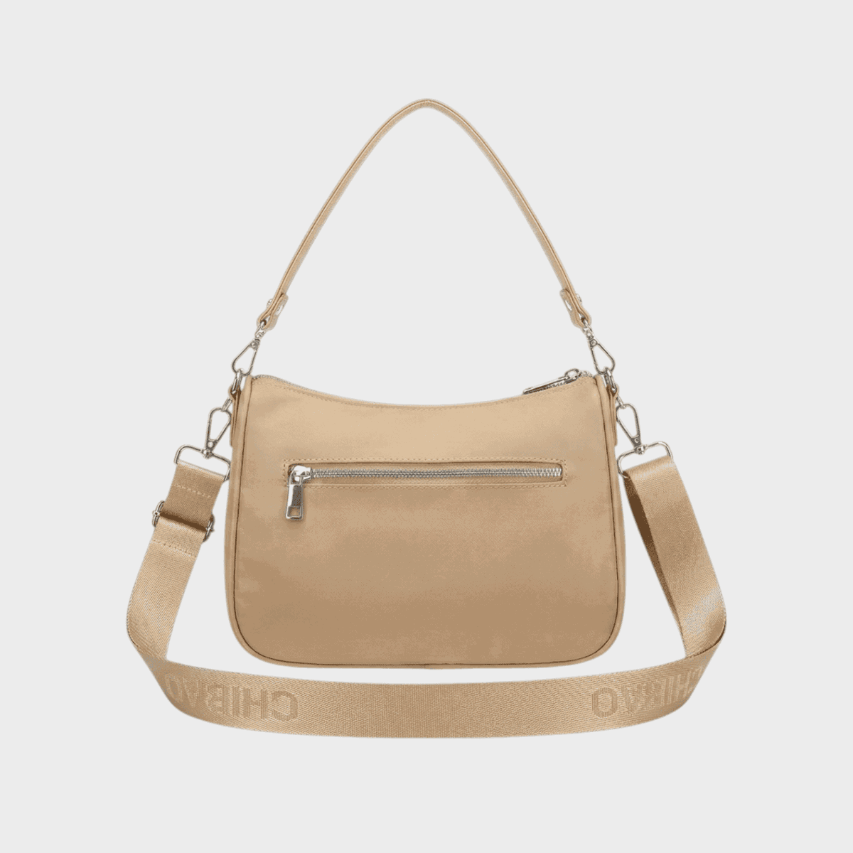 Descripción: Bolsillo principal con cierre interno y divisor. Cierre cruzado funcional en parte delantera, cierre en parte posterior. Correa corta y larga. Detalles de eco cuero.