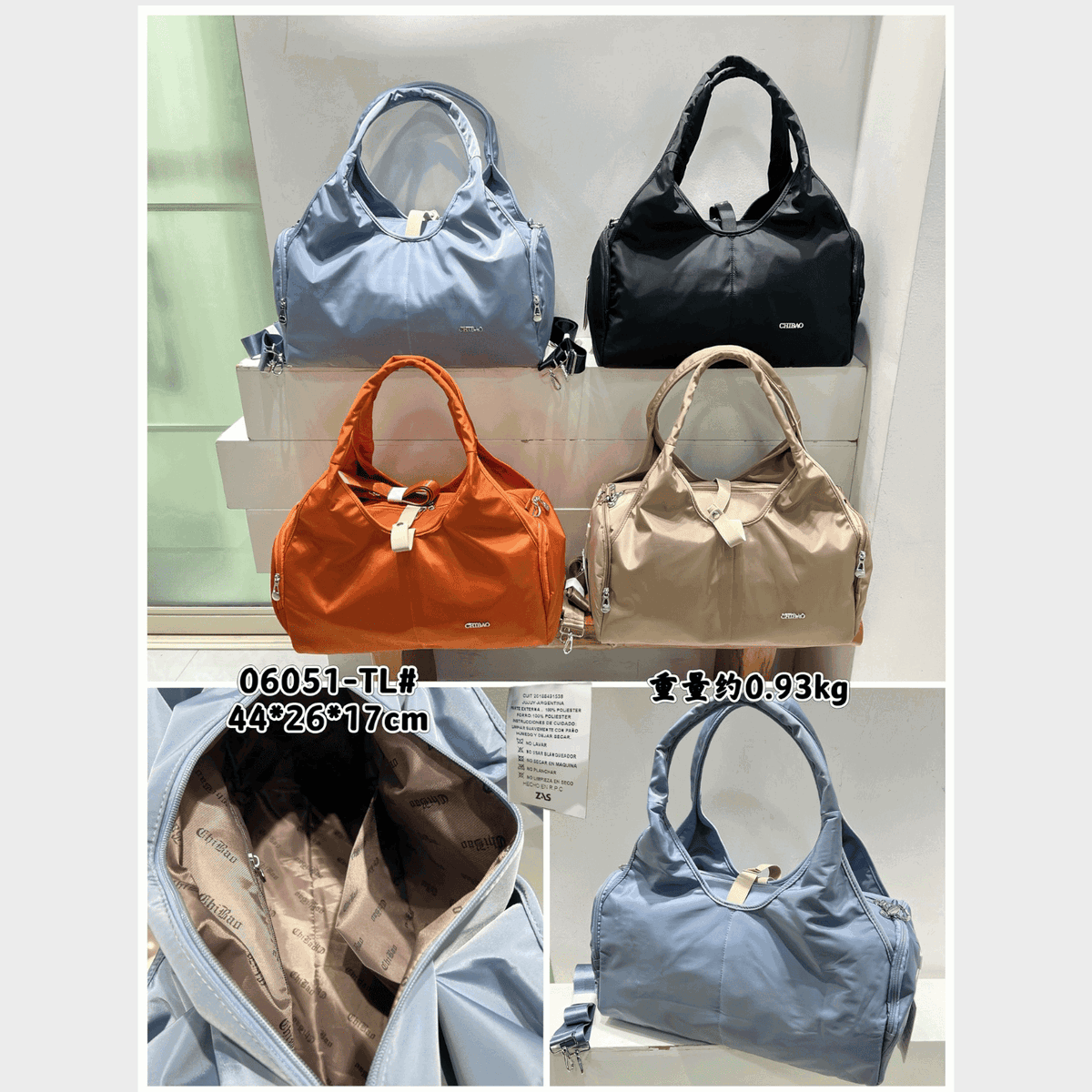 Material: Tela impermeable de alta resistencia, costuras y cierres reforzados.