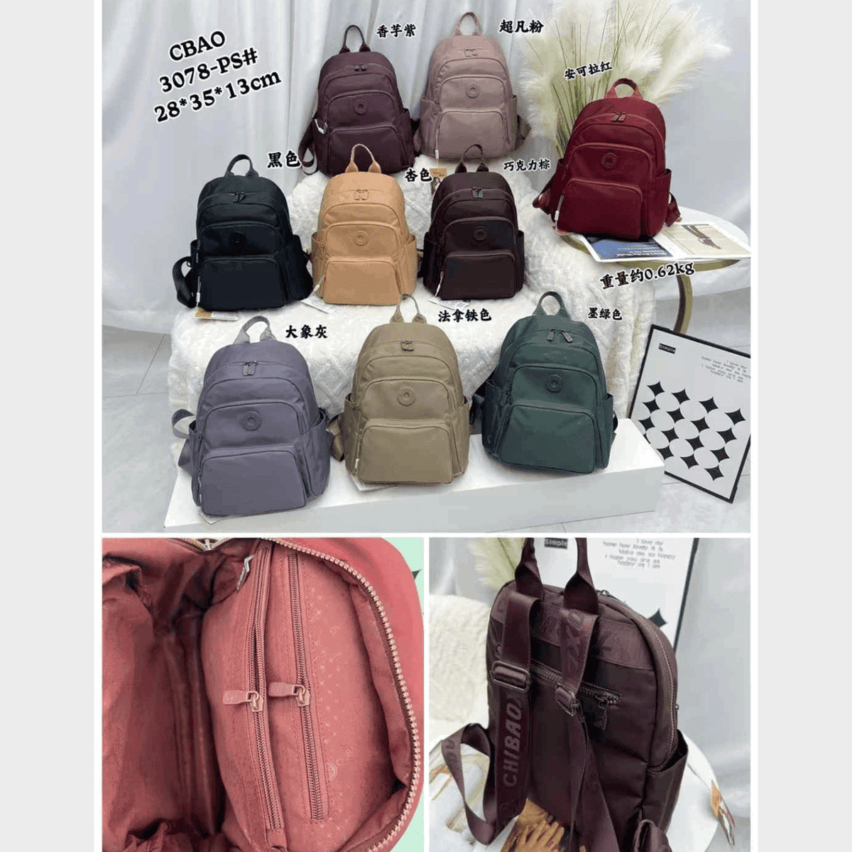 Material: Tela impermeable de alta resistencia, costuras y cierres reforzados.