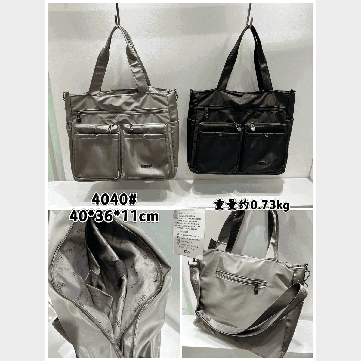 Material: Tela impermeable de alta resistencia, costuras y cierres reforzados.