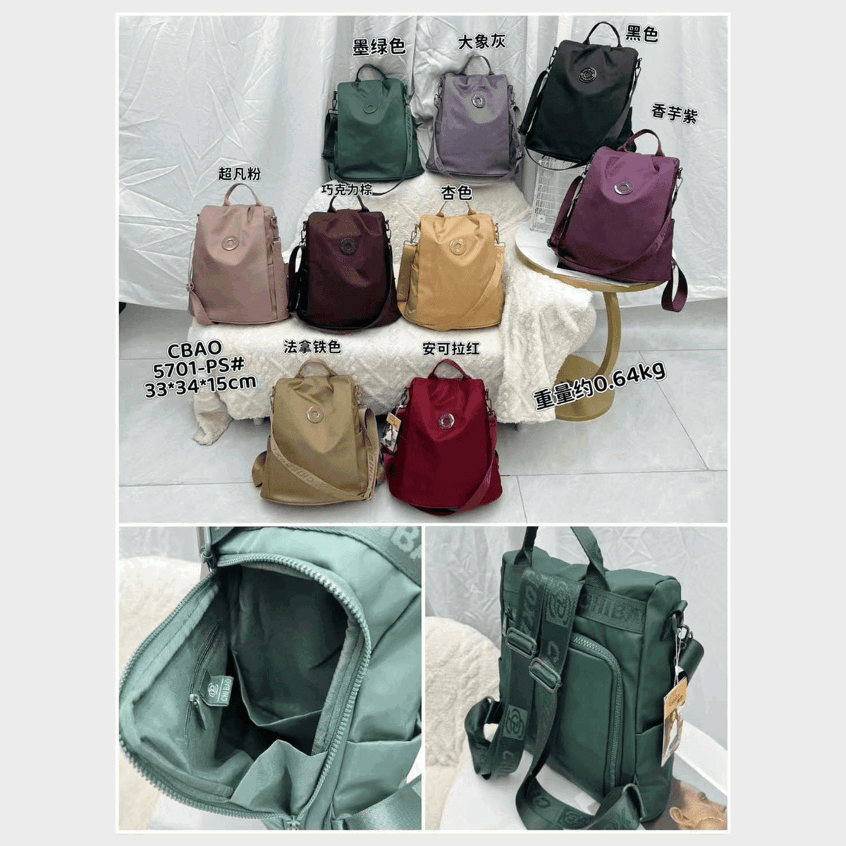 Material: Tela impermeable de alta resistencia, costuras y cierres reforzados.