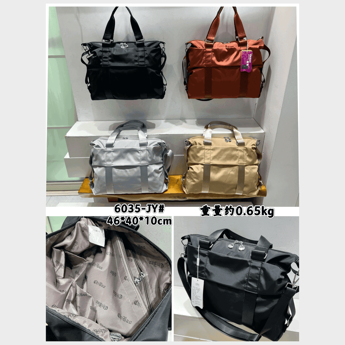 Material: Tela impermeable de alta resistencia, costuras y cierres reforzados.