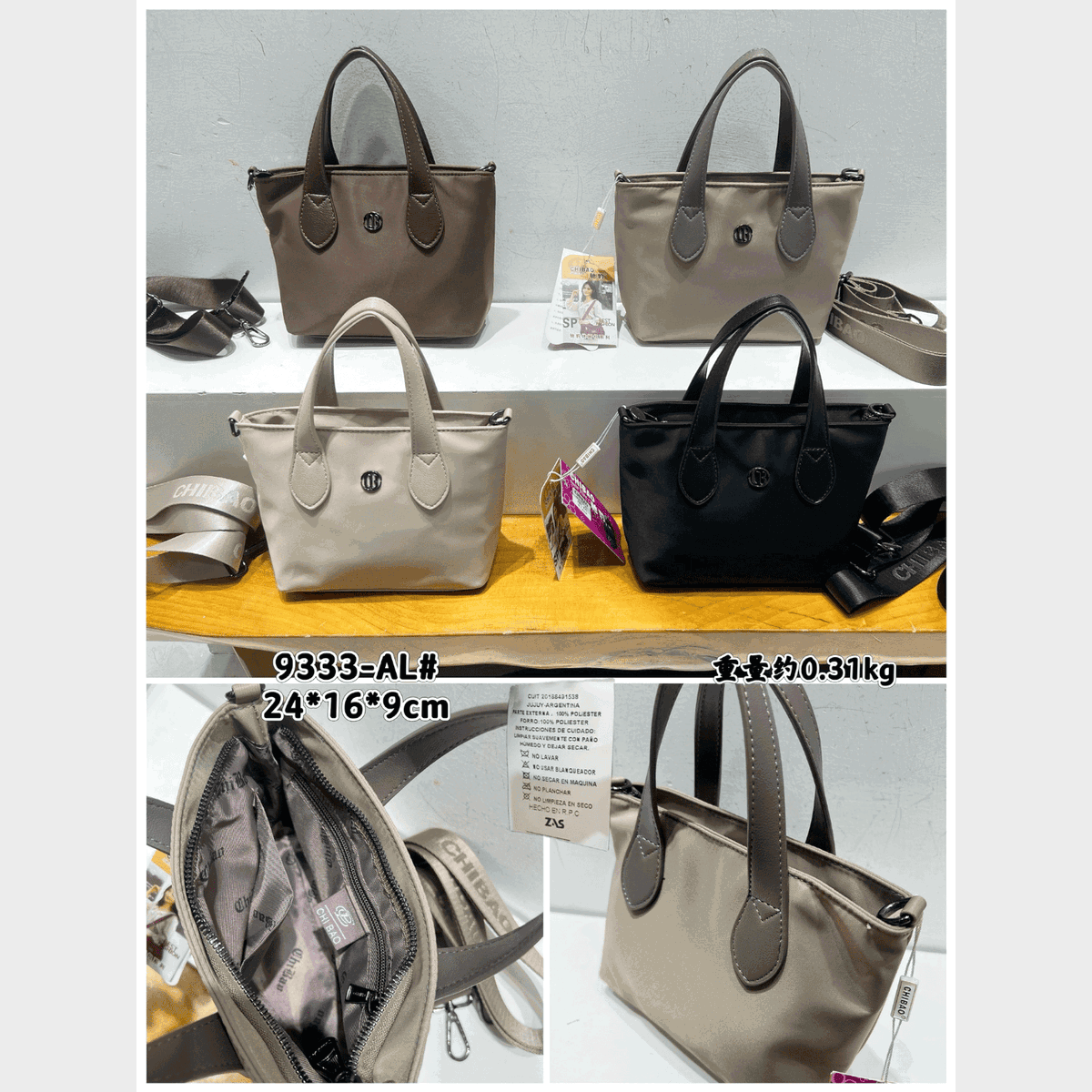 Material: Tela impermeable de alta resistencia, costuras y cierres reforzados.