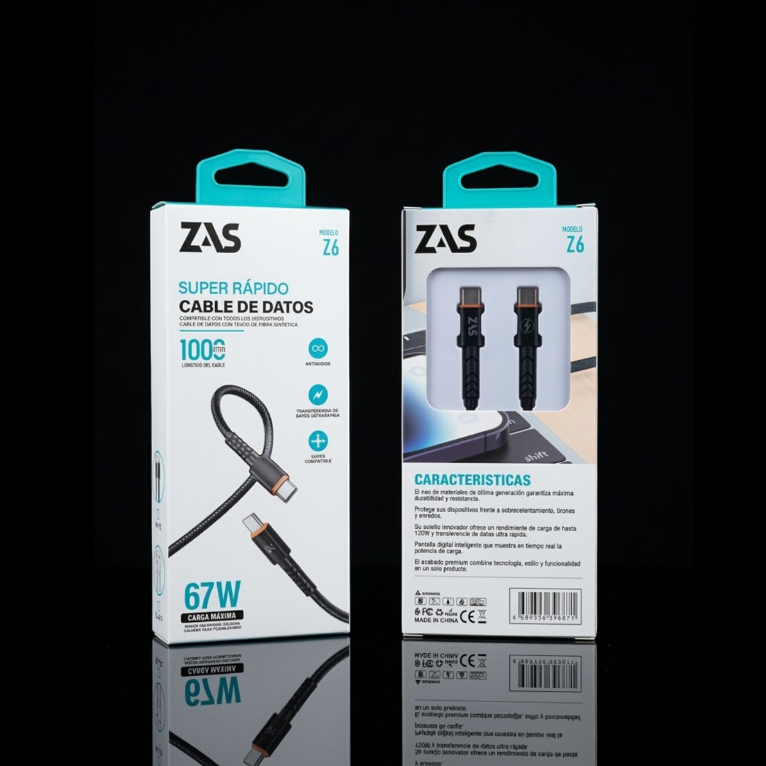 Cable Z6 súper rápido tipo C a tipo C, diseñado para ofrecer carga eficiente de hasta 67W y un rendimiento confiable en todo momento. Ideal para celulares, tablets y dispositivos compatibles con carga rápida.