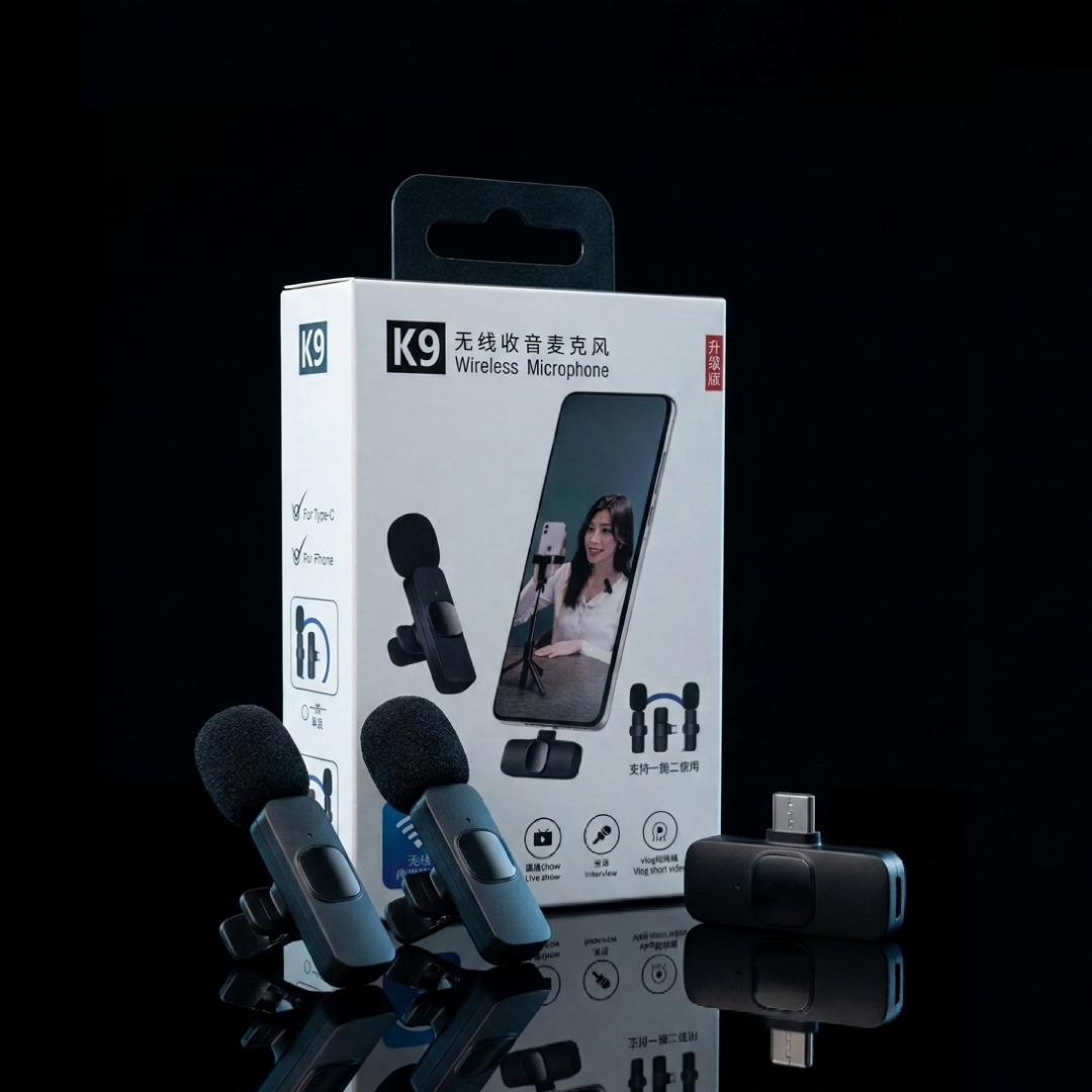 Micrófono corbatero K9 ideal para entrevistas, contenido en redes, clases o streaming. Incluye 2 micrófonos y 1 receptor, perfecto para grabar a dos personas al mismo tiempo sin perder calidad.